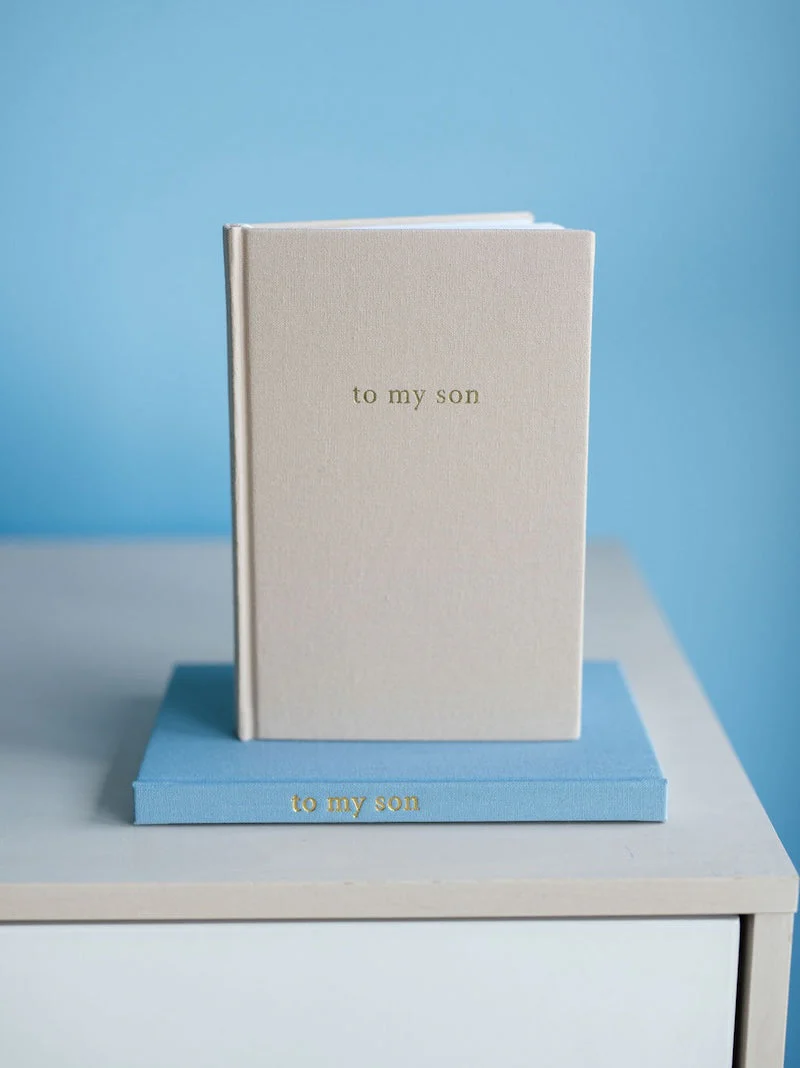 An heirloom to my son journal featuring our signature gold foil journal prompt stickers, designed to be started at any age and written in over time. A beautifully personal keepsake, perfect as a baby gift.